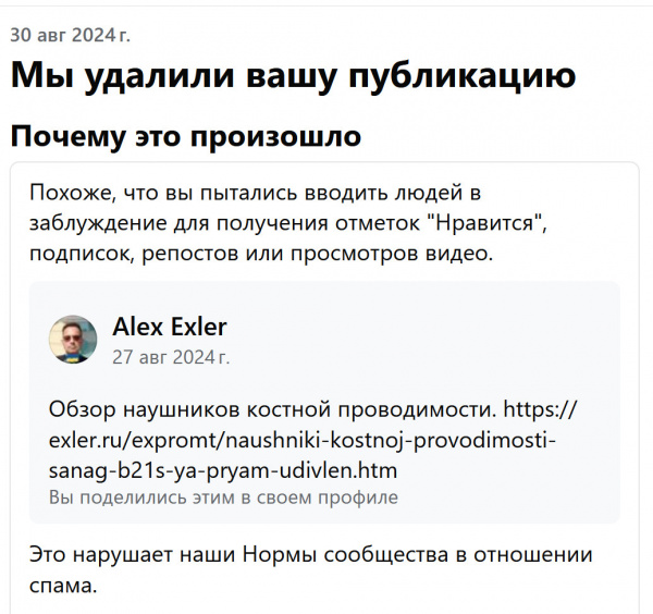 Издержки ИИ модерации и почти уверен что происходит подобное когда Nе количество жалоб поступает на публикацию. А то что профиль Экслера на ФБ под особым контролем "ольгинских" у меня вообще не вызывает никакого сомнения.