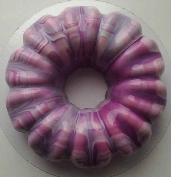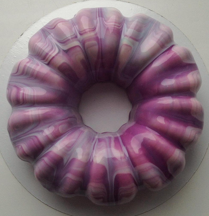 На глаз залито в формы Silikimart и Tortaflex, сверху обычный гляссаж и велюр.