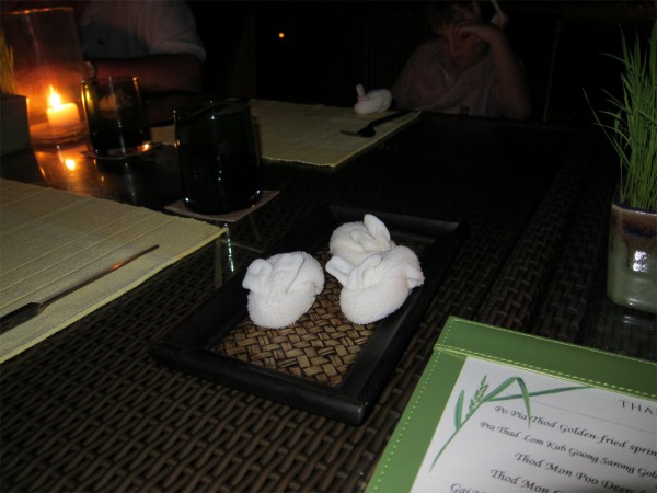 Столики в основном стоят на улице в окружении рисовых полей - антураж такой. Горячие влажные полотенчики для рук (признак крутого ресторана) принесли свернутыми в виде зайчиков.