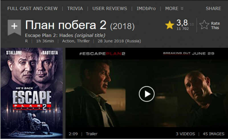 Первый "План побега", где Сталлоне играл вместе со Шварценеггером, был достаточно неплох - эдакий олдскульный боевичок, где два олдскула борозды не портили никак. Но когда я узнал, что они затеяли сиквел, причем в режиссерское кресло еще и посадили Стивена Миллера - вот тут я сильно удивился. Этого Миллера непонятно зачем вообще из гаража выпускают, ведь он снимает только несусветный отстой, который в прокат не попадает, а самый высокий рейтинг у его поделок - 5.27. И досниматься до Миллера - это довольно яркий и очень печальный показатель, который теперь имеют в своем арсенале Брюс Уиллис ("Первое убийство", "Налетчики" и "Спасение"), Николас Кейдж и Джон Кьюсак ("Арсенал"). Про Хейдена Кристенсена я вообще молчу - он до Андреасяна доснимался, тут вообще вопросов больше нет.