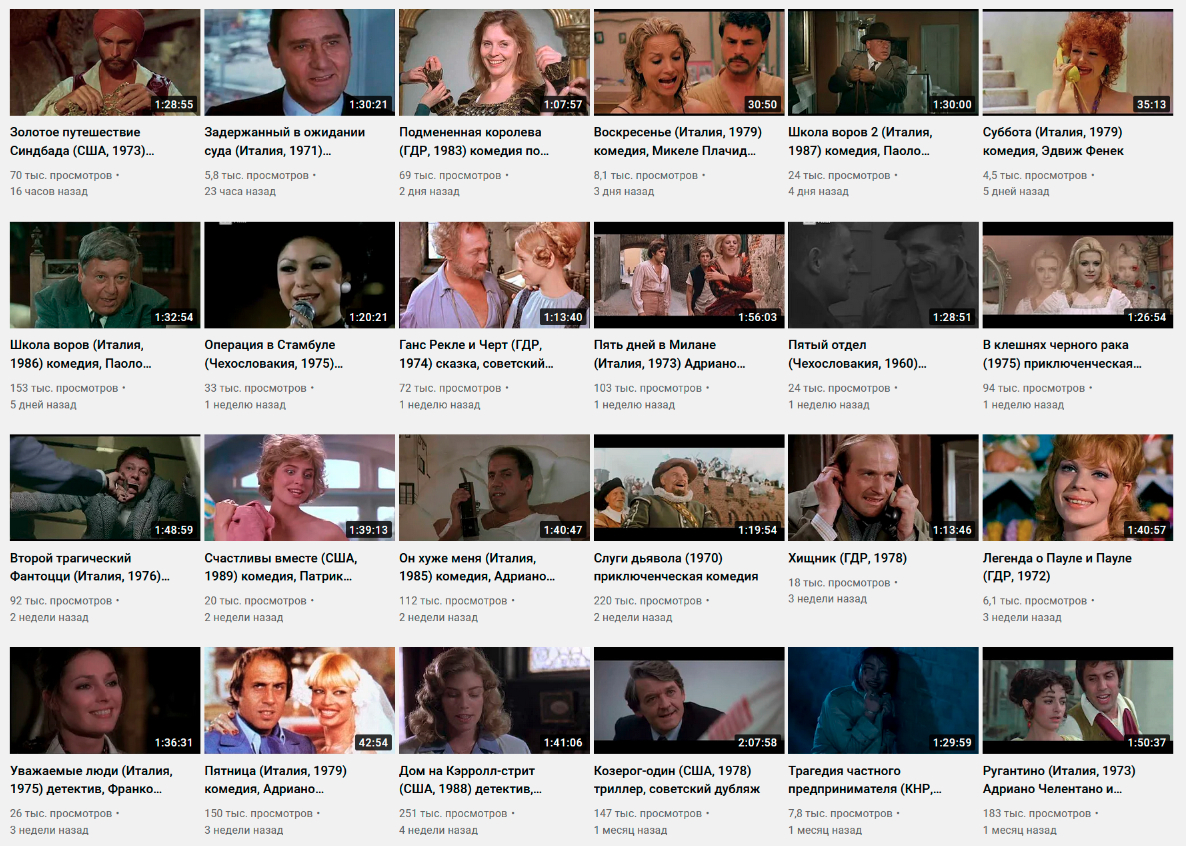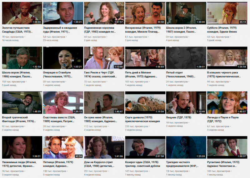 Отличный канал Бориса Антонова, на котором собрана большая коллекция фильмов семидесятых-восьмидесятых (в основном, с советским дубляжом). Ностальгия пробивает по полной! Старые американские фильмы, вроде "Каскадеров", французские комедии, итальянские комедии, старые фильмы с Челентано, французские детективы, фильмы с Гойко Митичем, зарубежные комедии советского проката, комедии с Паоло Вилладжо - в общем, практически все что угодно.