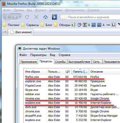 Заметил, что у FireFox под Windows7 есть серьезные проблемы с памятью. Не освобождает он память после закрытия окон. Точнее, освобождает, но не всю. Открываешь штук двадцать окон, закрывашь - а из отожранных, например, 600 мегов, освобождает всего 200. И получается вот такая интересная картина на пустом FireFox.