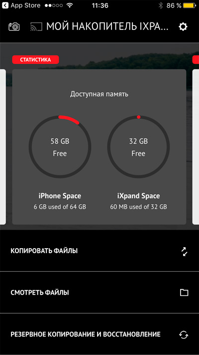 Для работы с ней на айфоне-айпэде, разумеется, нужно установить специальную программу из iTunes Store - SanDisk iXpand Drive.