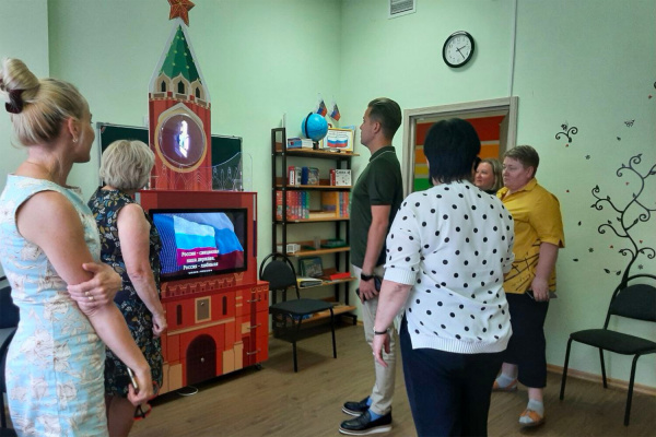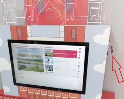 Компания "АВ Комплекс" разработала такое устройство. Это обычный компьютер с 32-дюймовым сенсорным монитором, на котором крутится простейшая справочная система. Обрамляет эту патриотическую установку макет Спасской башни Кремля. В ящичках нижней части башни разложены методички, карточки, плакаты и патриотичные настольные игры.