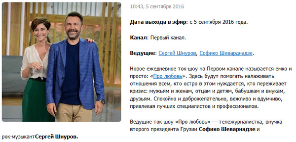Да ладно, Шнур всегда стремился на ТВ, вы разве не видели - он вел передачу про путешествия, не пошло. Но, Карл, Шнур - и путешествия? Прям его, ага. А тут про любофф, тоже прям совпало. (сарказм моде офф).