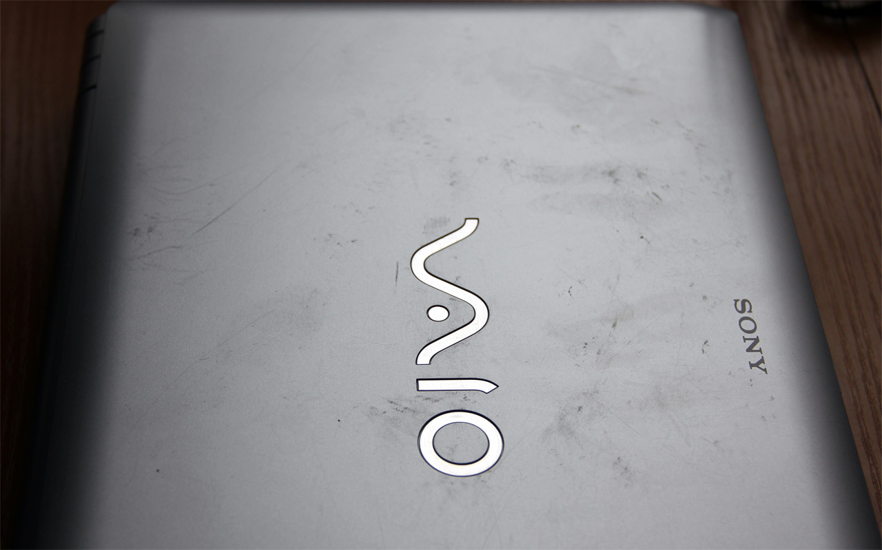 Дело в том, что я некоторое время назад в очередной (и, надеюсь, в последний) раз купился на название Sony Vaio, а купившись - купил компактный и легкий нетбук, который, к тому же, стоил вовсе не как самолет, а что-то там порядка $650. Мне же нужен был небольшой и легкий ноут для коротких поездок - надоело с собой таскать здоровую бандуру. К тому же мне эту модель рекомендовал cousin, который теперь за такие рекомендации должен мне пару бутылок реально хорошего вина, ибо ноут мне не понравился просто-таки совершенно, и я его после первой же поездки заменил на другой. Впрочем, речь вовсе не о данном конкретном ноуте, хотя его модель - Sony Vaio VPCYB1S1R. Речь о том, что в первой же поездке я этот нетбук неосмотрительно положил в одну сумку с iPad. С айпэдом ничего не произошло - ни малейшей царапины. А вот у хваленого Sony Vaio крышечка стала вот такая.