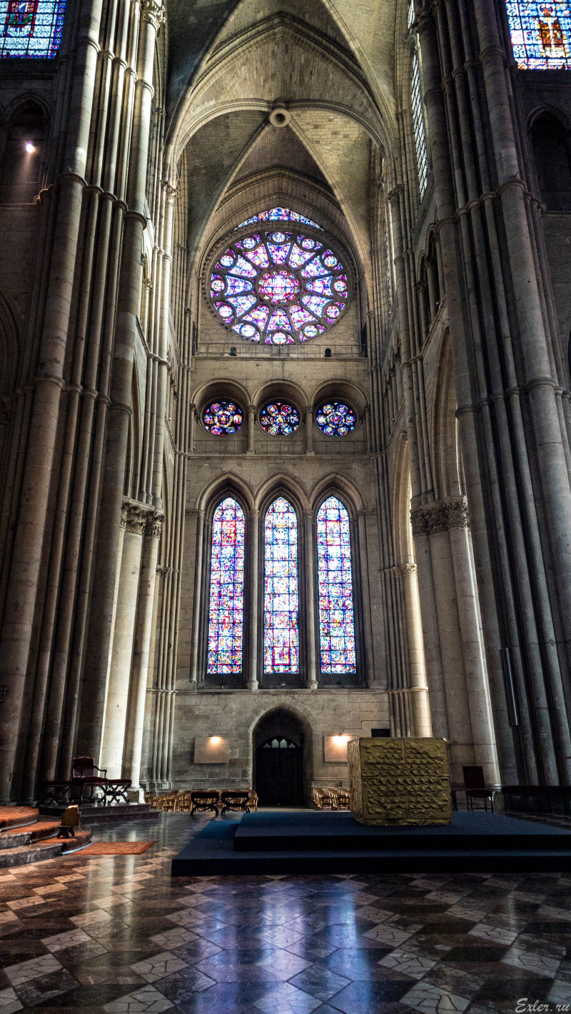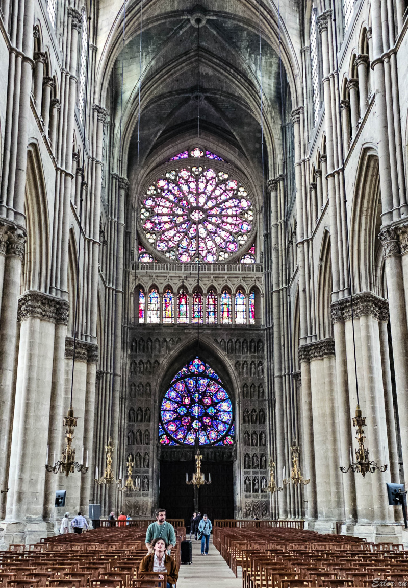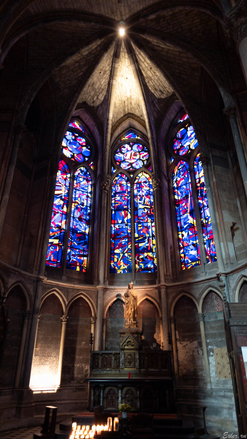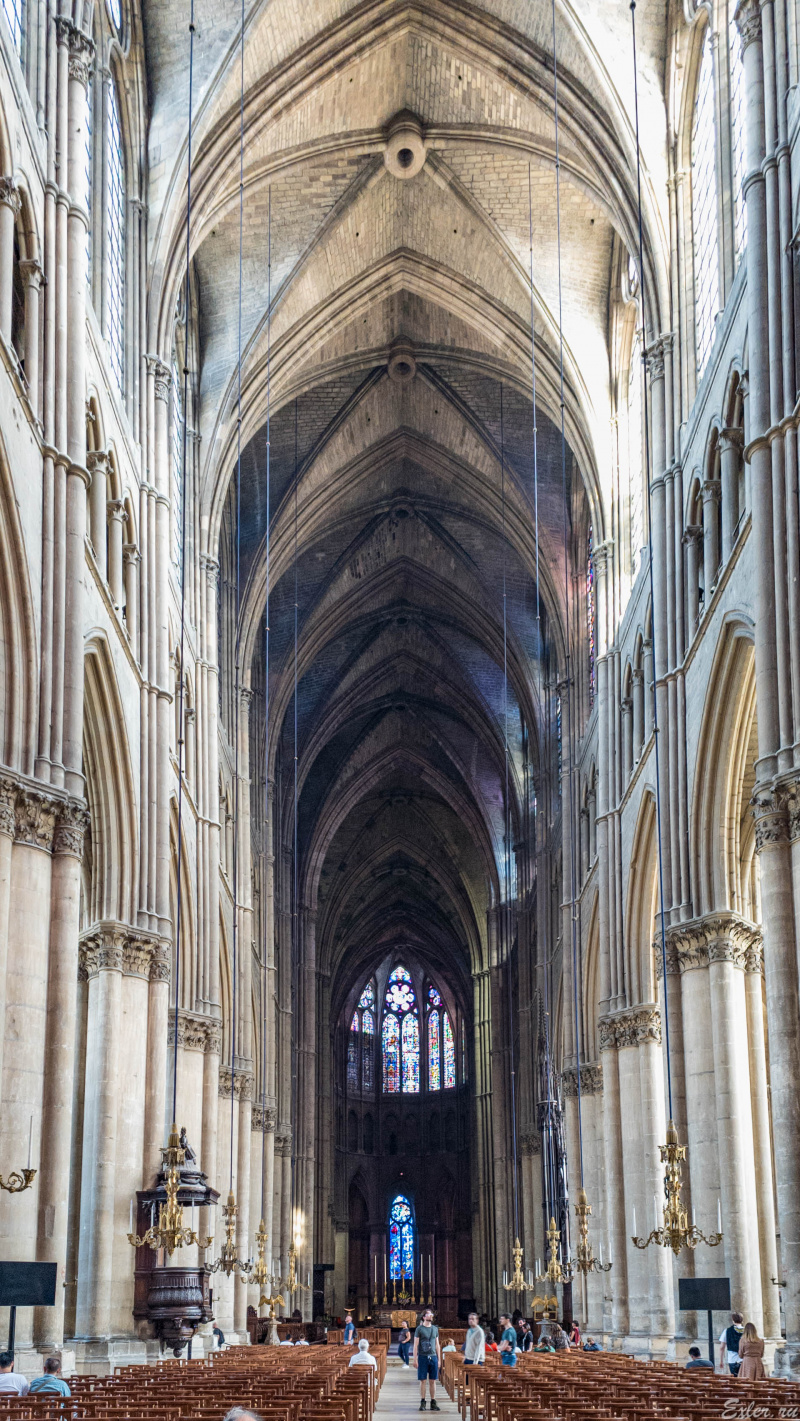 Внутри собора - вид на витражи задней, восточной части. Длина центрального нефа собора - 149 метров - это самый длинный неф во всей Франции.