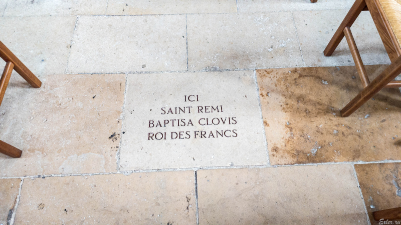 Плита, на которой написано: "Здесь святой Реми крестил Хлодвига, короля франков". В память о том, когда Святой Реми, епископ Реймса, крестил Хлодвига I, первого короля франков, что стало ключевым моментом в истории Франции и христианства в регионе.
