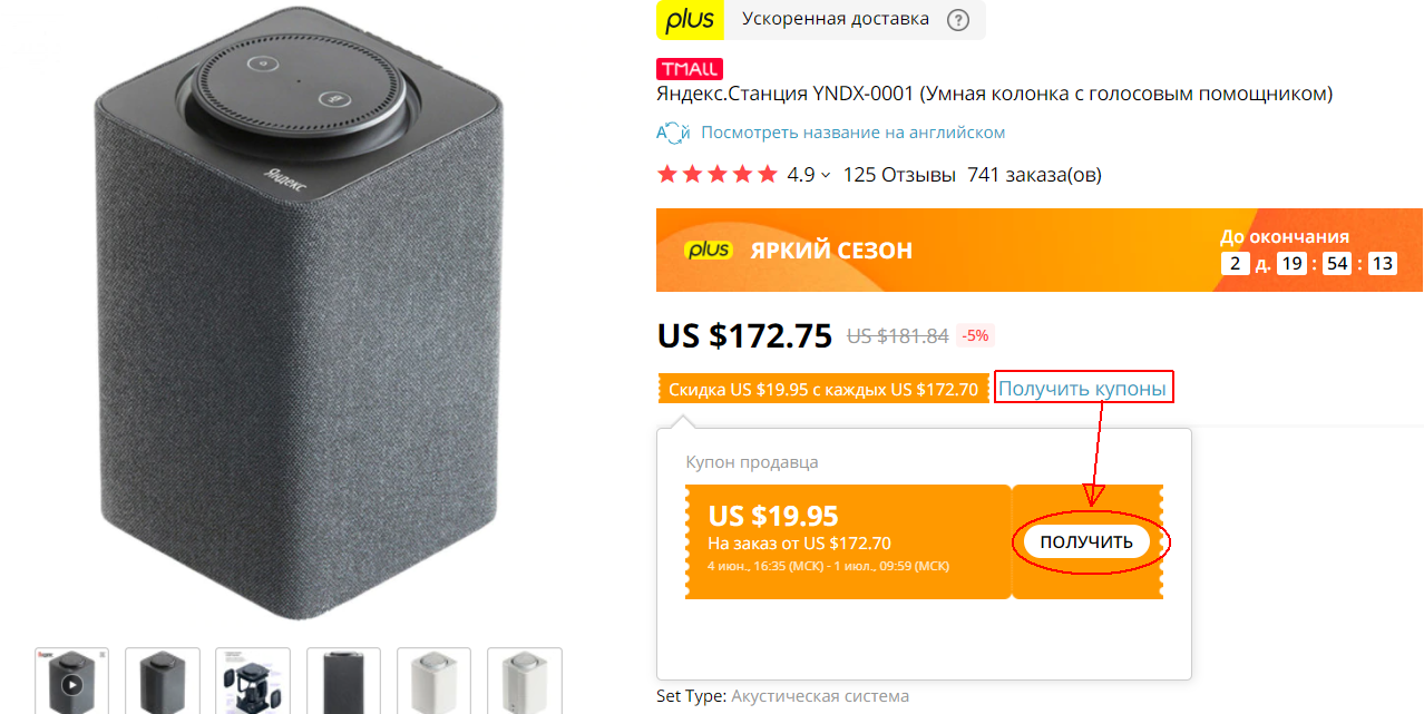5. Яндекс-станция за 9490 рублей. Для такой цены надо взять купон (как? см. ниже на картинке) и использовать промокод "HEY2000".