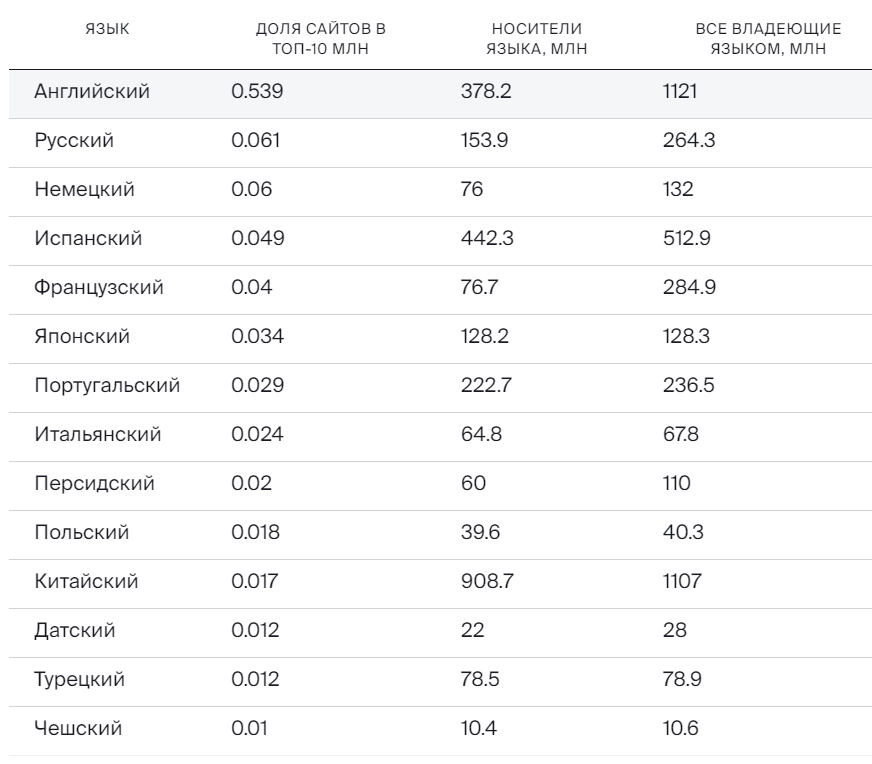 И если тыцнуть на ссылку Ethnologue, которай в стаье, цыфири там совсем другие. там и английский лидирует, и французский никуда не пропал. Так что я бы поостерегалась читать товарища Niall McCarthy. Он хоть и позиционирует себя, как Data Journalist, но с данными несколько вольно обращается.