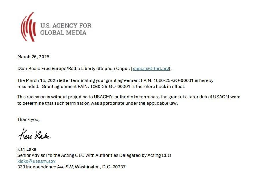 Окружной суд США в Вашингтоне (округ Колумбия) в своем постановлении от 25 марта заявил, что агентство, вероятно, действовало «произвольно и капризно», прекратив грант RFE/RL, и что эти действия нанесут вещателю «непоправимый вред», если будут реализованы.