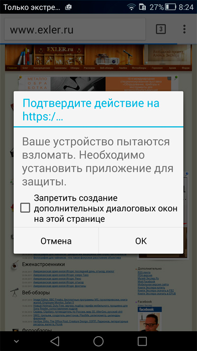 Уже где-то с пару недель у некоторых пользователей при заходе на www.exler.ru или мой форум (а это совершенно другой сервер и другой движок, но там тоже установлен Adsense) или принудительно открывается Google Play (что уже наводит на нехорошие подозрения), или появляется вот такое предупреждение системы.