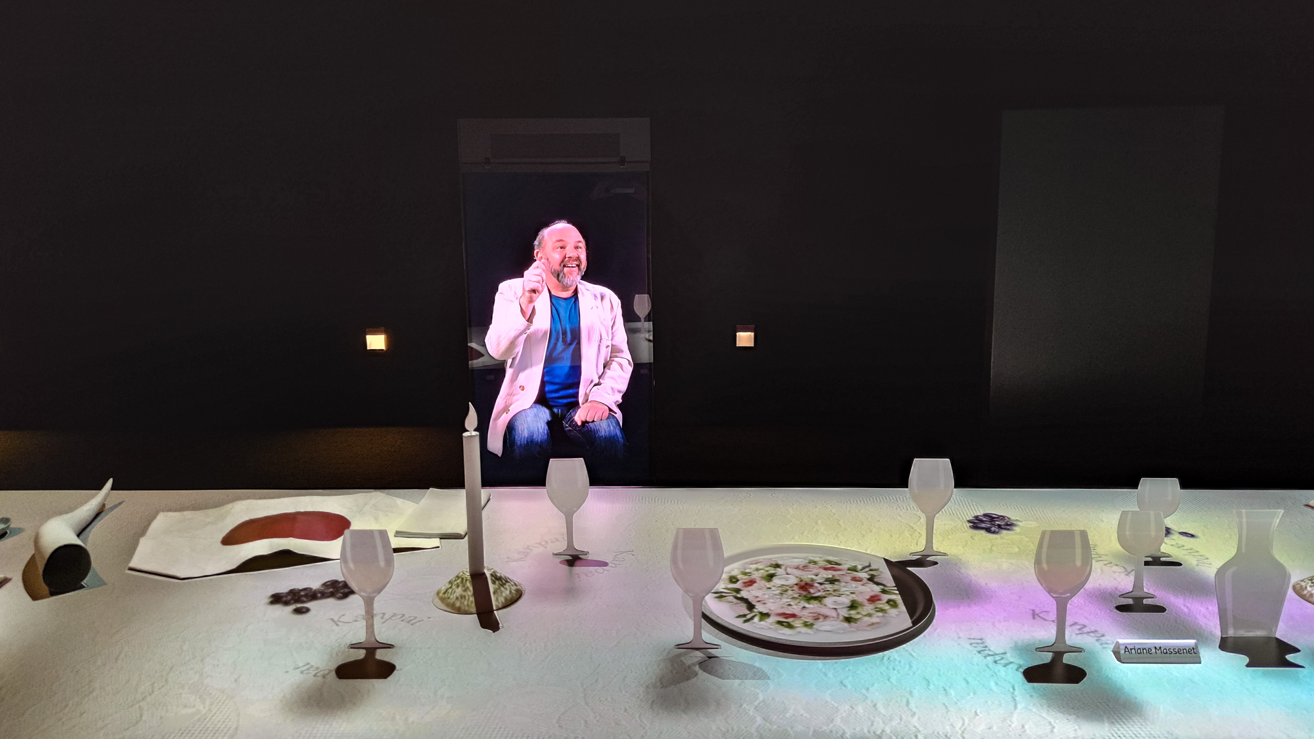 А вот это единственно действительно прикольное место. Накрытые столы, вокруг столов мониторы в человеческий рост, в которых проецируются различные специалисты, разговаривающие друг с другом.