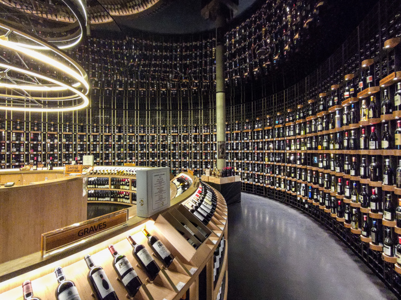 а верхних этажах вина уже за стеклом, по несколько тысяч евро за бутылку.