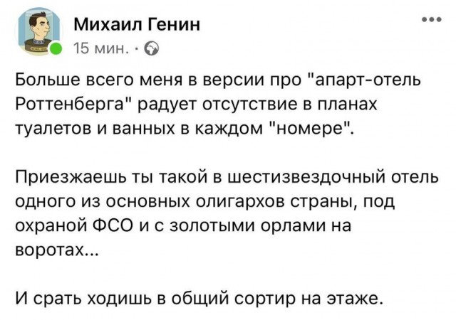 После этого тут же вытащили Ротенберга, который что-то там пробормотал о том, что это "апарт-отель на 16 человек" - ну, вы понимаете, охраняемый ФСО, с бесполетной зоной и все такое прочее, - я даже считаю, что это фактически хостел.