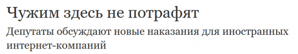 Комитет Госдумы по информационной политике, технологиям и связи разрабатывает законопроект, который ужесточит ответственность зарубежных интернет-компаний за неисполнение российского законодательства в части хранения персональных данных, удаления противоправного контента и неуплаты налогов с деятельности на территории страны, рассказал источник “Ъ”. По его словам, речь идет о повышении фиксированных штрафов и введении штрафов с оборота в России или даже в мире, а также применении технических мер, например замедления трафика передачи данных. Финальная версия документа может быть официально внесена в октябре. (Отсюда.)
