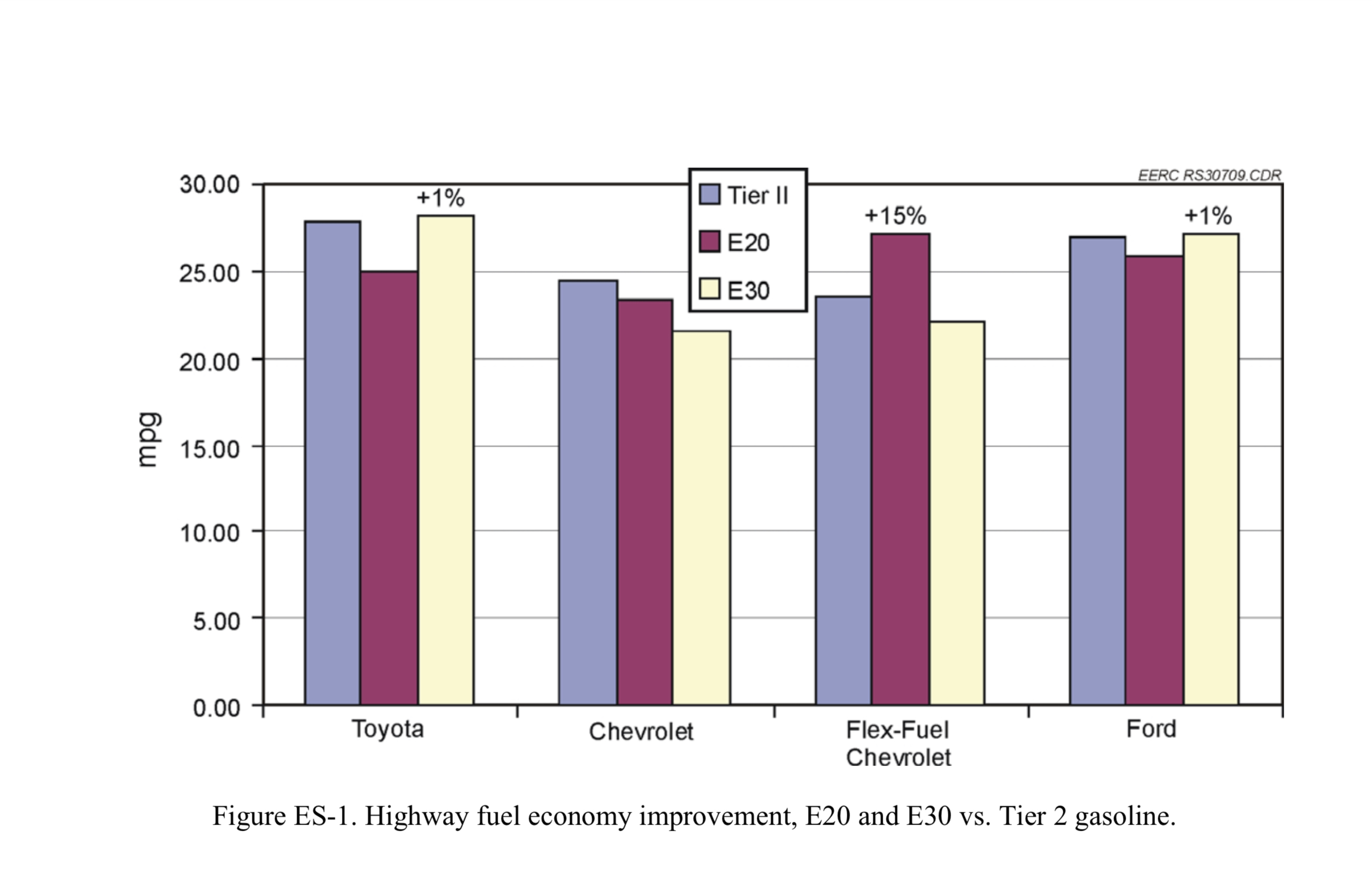 Если бензин, разбавленный на 10% достаточно дорогим заменителем, где-то на столько же менее эффективен, можно заменить замещаемый объём ослиной мочой. Это будет дешевле и куда менее вредно для экологии, чем производство кукурузного спирта.
