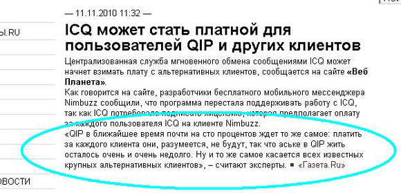 Канал "Вести-24" сегодня показал сюжет про это со скрином отсюда "как считает известный блогер Алекс Exler...", потом было интервью с директором компании, которая qip пишет - сказал "за каждого клиента платить не будут, непонятно чего хочет mail.ru". Ну и дальше про jabber что все туда мигрируют и что все там будем.