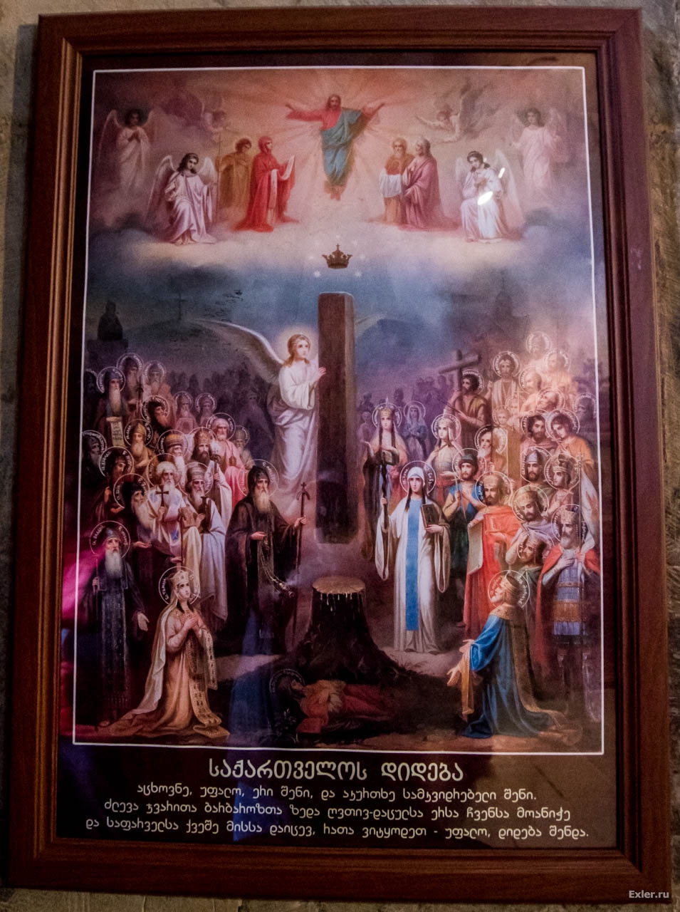 В центре сверху - Иисус Христос, в центре снизу - животворный столп, сделанный из кедра, который Ангел поднимает ввысь как в Воздвижении Креста. В честь этого животворного столпа создан главный в Грузии собор, находящийся в городе Мцхета - этот собор виден с горы, где расположен храм Джвари.