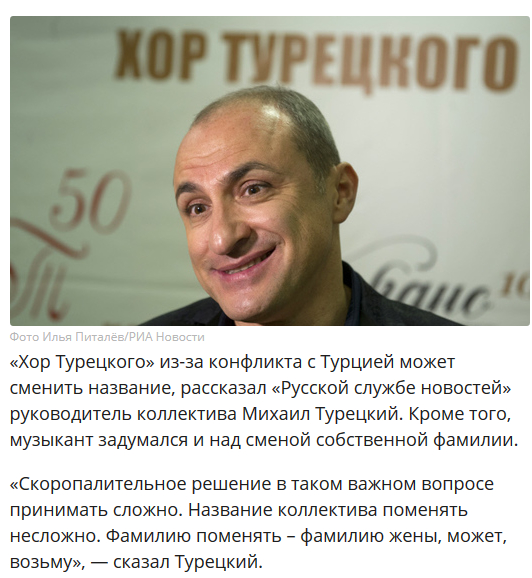 Алекс, ну Вы же понимаете, что главный герой данного поста хочет поменять брэнд, а не фамилию. Ведь после инцидента с Су-24 наши люди не хотят кушать турецкие продукты, отдыхать на турецких пляжах и, вполне возможно, не захотят идти на концерт Хора Турецкого. Кстати сказать, среди клиентов моего магазина есть такие, которые отказываются покупать продукцию таких компаний, как Рошен, Оболонь, Хортица. И отнюдь не потому что их товары невкусные - из-за политических убеждений. Так вот, для того чтобы новое название хора принесло ему прибыль, предлагаю его руководителю взять фамилию Анти-Турецкий!
