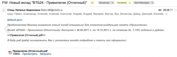 Стець Наталья Борисовна, судя по всему, обладает разумом уклейки, раз она делает достоянием общественности всех VIP-клиентов банка "ВТБ24", да еще и с их адресами. А уж о том, что у нее ума не хватило отредактировать в массовой рассылке "рад (рада)" - это уже совсем за гранью чего бы то ни было.