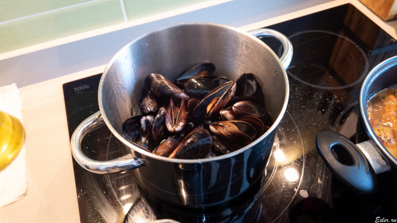 Мидии при готовке выделяют много совершенно нам не нужной влаги, поэтому мидии варятся отдельно: немного масла, стакан белого вина, ну и варятся они буквально 5 минут: как раскрылись - все, готовы.
