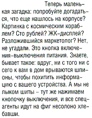 Но Зоберн - он легких путей не ищет! Мы уже наблюдали за тем, как он, описывая достаточно сложные устройства, ухитрился нагнать тонны дурацкого гона, об устройствах так ничего и не сказав. Теперь задание было проще: нагнать такого же гона, описывая устройство, о котором и говорить-то особо нечего. Разумеется, Зоберн с этим справился. Пара бородатых анекдотов, традиционные отвлеченные рассуждения о всякой чуши - и полоса заполнена. Подробное описание тряски пустой коробки, внутри которой что-то там постукивало - тронуло меня просто до слез. Это гениально. А уж по поводу кнопки питания - пассаж совершенно изумительный, цитирую: