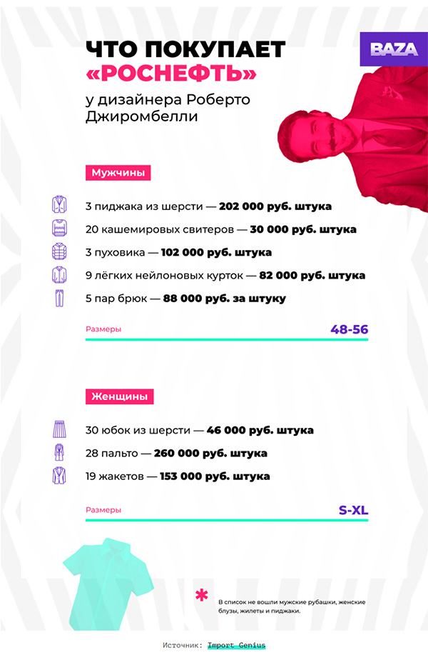 Помните, как Сечин недавно засветился в модной итальянской курточке? Baza провела расследование того, сколько госкорпорация "Роснефть" потратила на дизайнерскую одежду именитого итальянского кутюрье Роберто Джиромбелли. Оказалось, что немного - всего-то €1,3 миллиона. А хренли мелочиться-то, действительно.