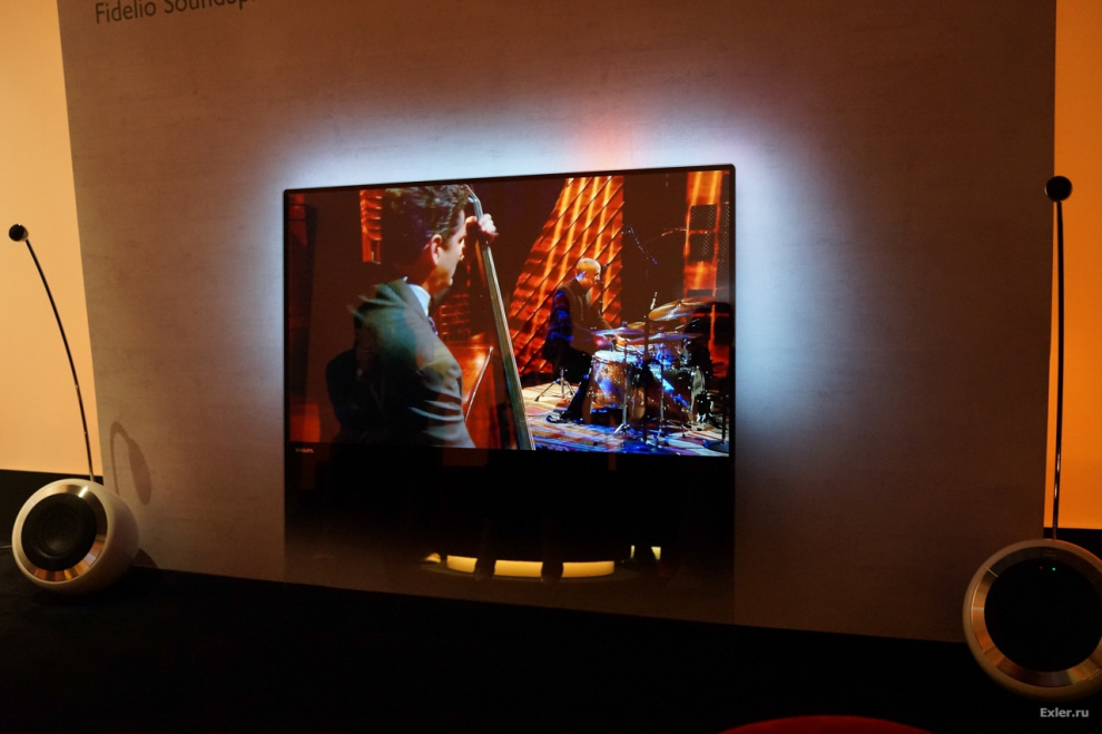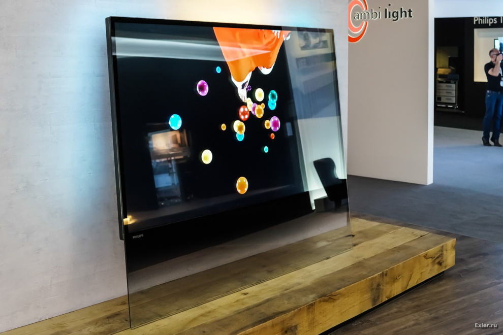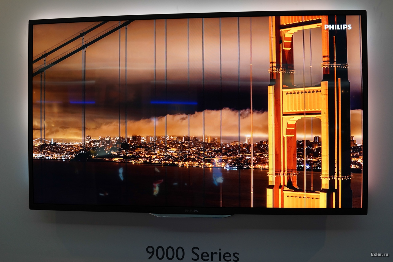 Из телевизоров представили новую девятитысячную серию с диагональю в 65 дюймов и аж 84 дюйма. Как обычно у Philips, телевизор снабжен системой Ambilight: это когда по всему периметру задней крышки разноцветные лампочки создают на стенке как бы продолжение картинки. Эдакая видеоцветомузыка.