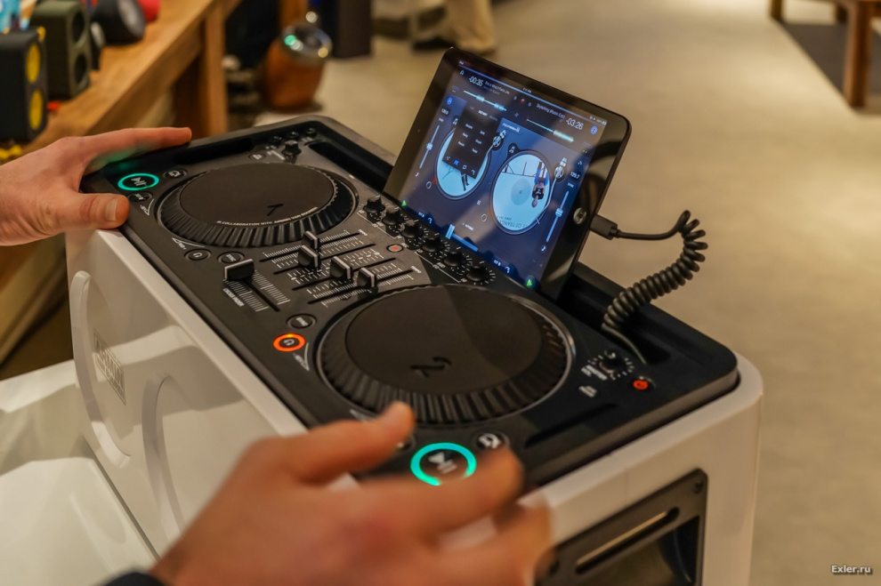 Ну и в конце представили очень любопытную штуку - MIX-DJ. Это очень компактный переносной диджейский пульт с собственными динамиками, который работает в связке с айпэдом, на котором устанавливается специальная диджейская программа.