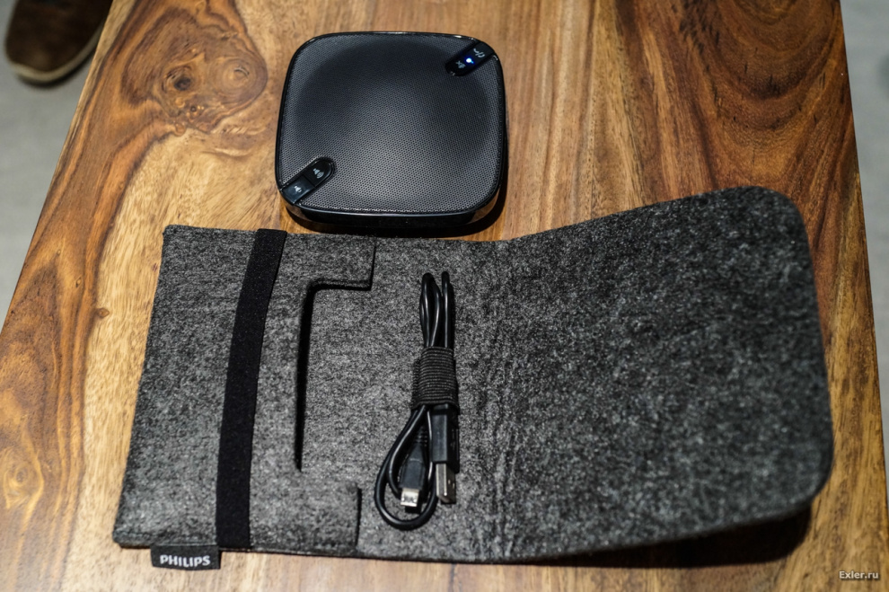 Полезная штука - беспроводная колонка для конференц-связи. Из нее идет звук, вокруг нее может сидеть несколько человек и разговаривать с собеседниками на другом конце. Лет пять назад мне похожую штуку китайцы привозили - я ее использовал некоторое время. Правда, там дизайн был не в пример похуже.