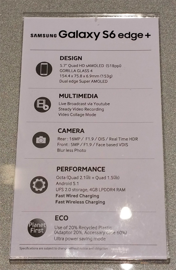 Вот характеристики. Да, разрешение здесь, как и у S6 edge, 2560×1440, однако тут матрица, созданная по технологии PenTile RGB, а она при таком разрешении (там на самом деле есть некоторые тонкости в подсчете разрешения, которые я не хочу сейчас обсуждать) и выглядит очень хорошо, и от батареи живет вполне прилично - что и было продемонстрировано на примере Samsung Galaxy Note 4. Модель S6 edge, правда, от батареи живет слегка поменьше, как говорят (я ее не тестировал), но не критично.