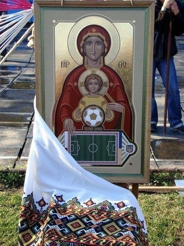 Если честно, не вижу разницы между иконами "Богоматерь моря" (расположена в дворце Ахиллеон, Корфу, написана по заказу австрийской императрицы Елизаветы) и иконой "Богоматерь Футбола". Ну, кроме художественных достоинств и размера, Franz Matsch постарался явно лучше, чем пока что безвестный украинский богомаз...