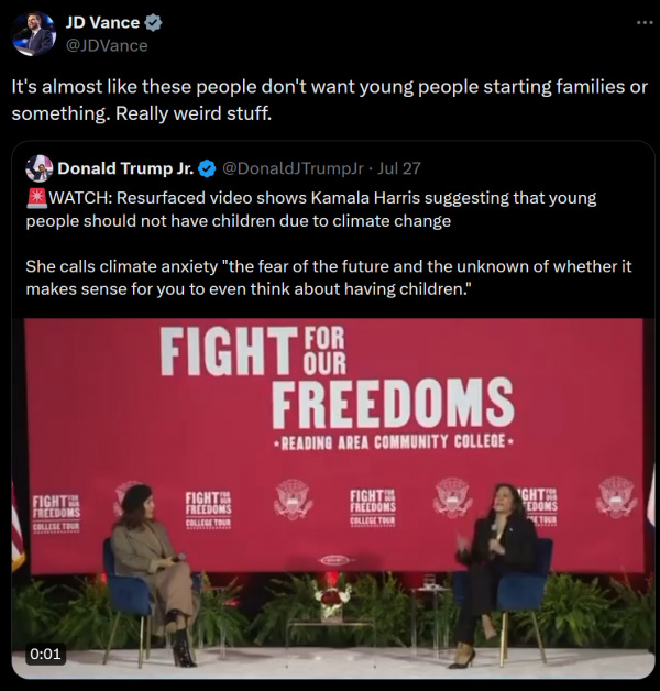 Ну и чтобы из этого сделать вывод, что Камала - сторонница вымирания, надо быть чрезвычайно одаренно эксцентричным вплоть до полного мудачества человеком, таким как Вэнс или товарищ Илон Маск.