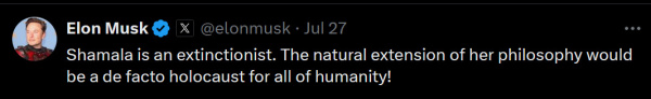 Но товарищ Маск в своем комментарии превзошел и Трампа-младшего, и Вэнса, заявив: "Шамала - сторонница вымирания. Естественным продолжением ее философии станет фактический холокост для всего человечества", чем, конечно же, продемонтрировал себя человеком более чем эксцентричным. Предельно, я бы даже сказал, эксцентричным.