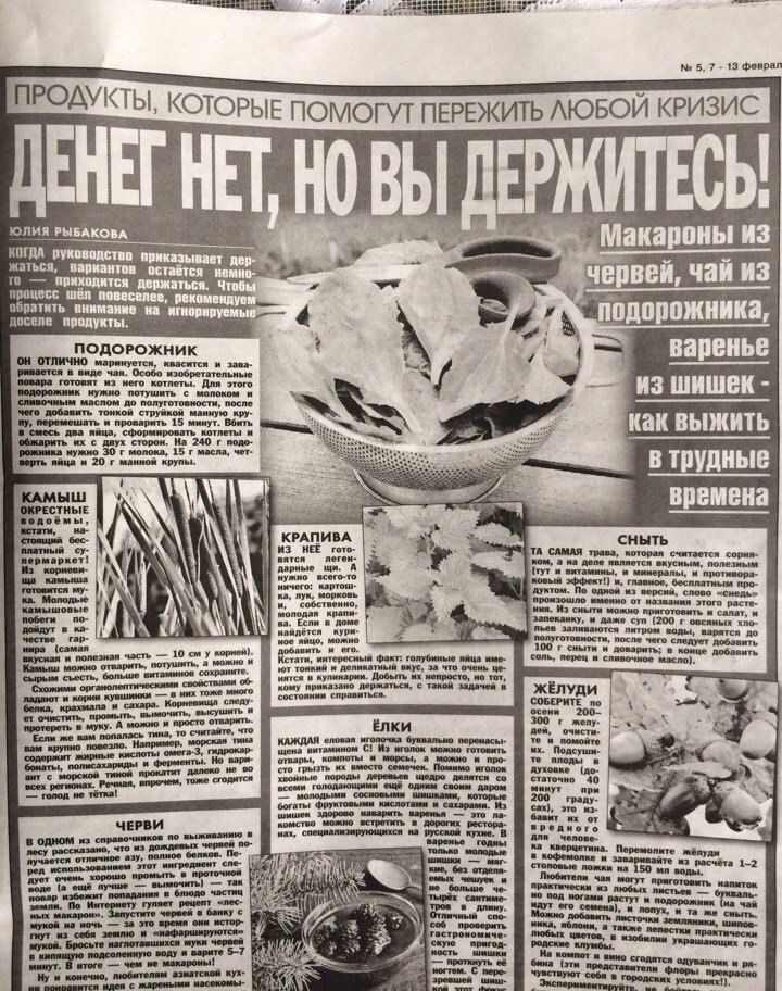 Да что вы в самом деле панику разводите? Все хорошо. Скоро крапива, лебеда пойдёт. Какие щи и салаты из неё получаются! Ваша руккола по сравнению с ними - ерунда. Запасов картошки и солений у народа много. Мясо? А что мясо? Готовится указ о введение наказаний за оскорбление чувств вегетарианцев. То есть мясо будет объявлено исторически несвойственной едой россиян и запрещено к продаже кроме спецраспределителей. Знаете, почему англо-саксы и украинцы такие вредные? Мясо едят. А это неестественно для нормального человека. Кофе, чай и газировка - отрава. Квас - наше все. Кстати, 15 лет за фейки про вкусность импортной еды - на подходе. Не переживайте, все хорошо.