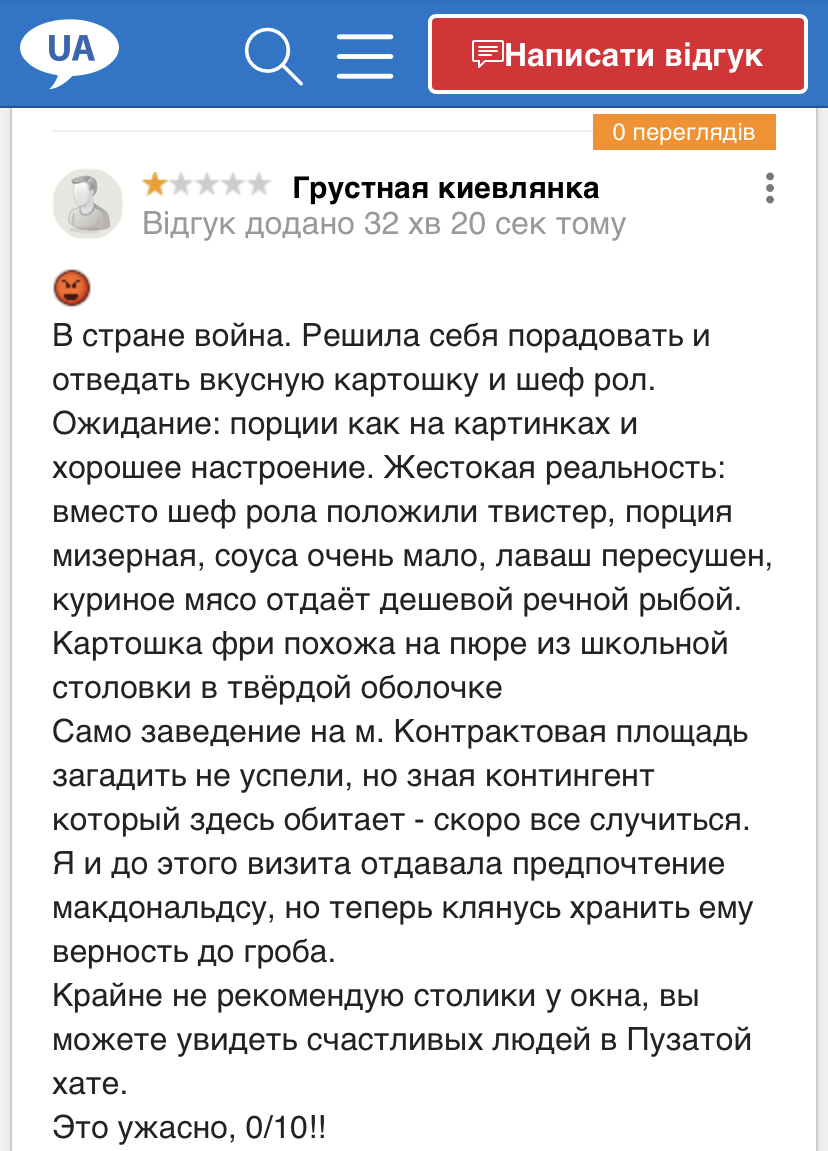 Не согласен, очень круто. И когда откроется за пределами страны, макдональдс будет тихо плакать в сторонке, потому что все увидят как вкусно и откроют в каждой стране НАТО на каждом углу Вкусно-и-Точка-авто. Но это будет после того как НАТО потерпит сокрушительное поражение и приползёт на коленях каятся, что каких-то хохлов поддерживало!