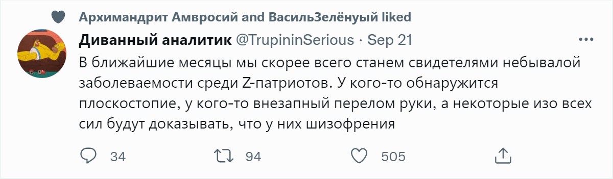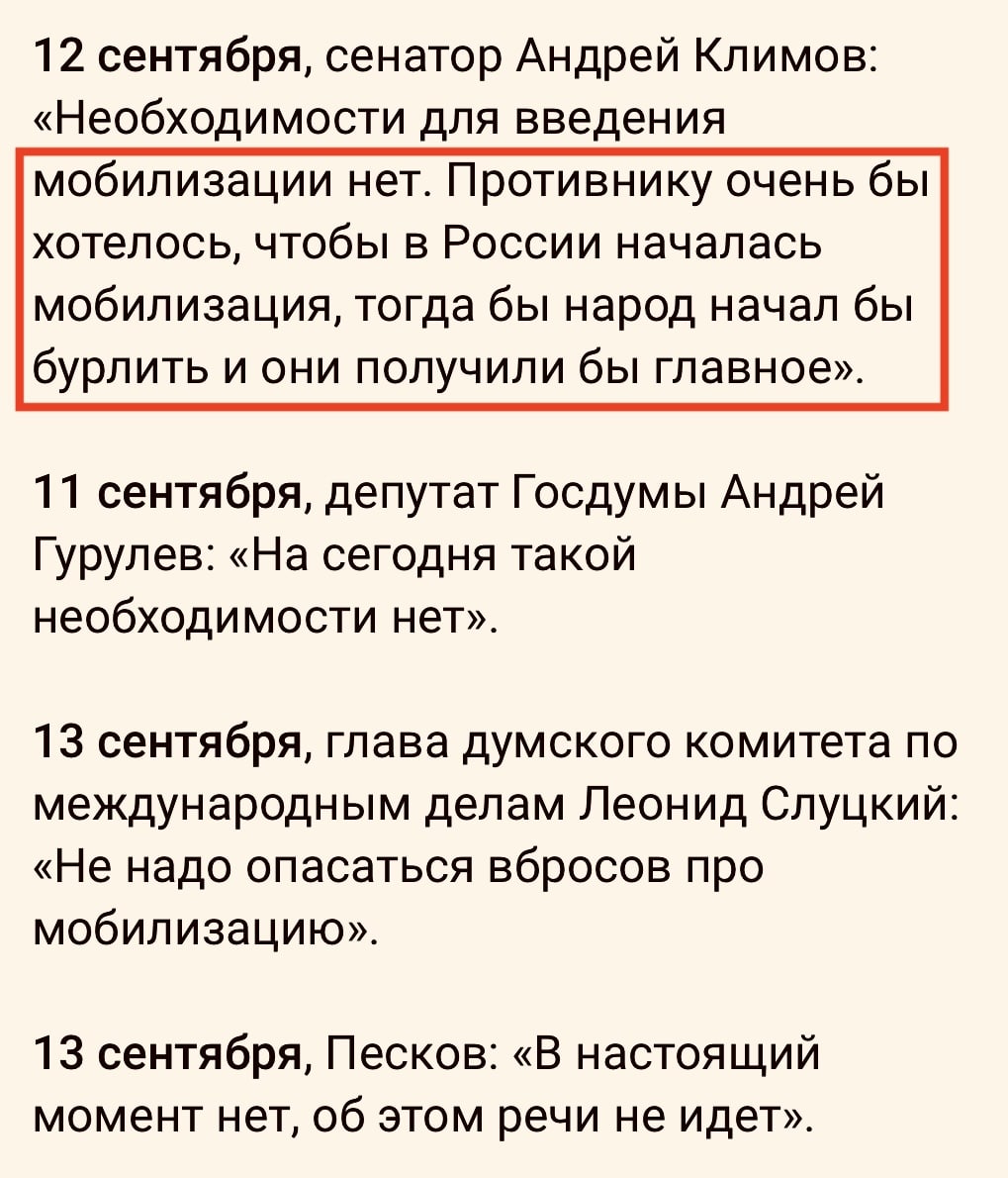 Однако ещё более важным станет невиданное разрушение даже иллюзий народного единства. Главными бенефициарами процесса станут руководители призывных комиссий – и при нынешнем уровне продажности бюрократии, помноженной на удивительно размытые формулировки указа о мобилизации, можно не сомневаться, что на фронт окажутся доставлены только те, кто не в состоянии будет откупиться от священного долга уничтожения братьев по когда-то единой стране. Как и сто с лишним лет тому назад, неосмотрительная и зажравшаяся власть вооружит бедных и сделает всё от неё зависящее, чтобы они возненавидели своих правителей как можно сильнее. Лозунги поражения собственного правительства в империалистской войне родятся без всякого нового Ильича – просто потому, что не стоит надеяться, что простые люди, привыкшие к относительно размеренной жизни и благодаря пропаганде предполагающие, что войска НАТО должны разбегаться от одного вида русского танка, сочтут фронтовые условия достаточно комфортными. (Отсюда.)