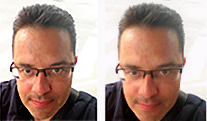 Ну, ладно, проверил. Взял фото размером всего 100 пикселов. Увеличил сервисом. Взял то же фото и увеличил до того же размера в "Фотошопе" обычным ресайзом. Ресайз - слева, индийский искусственный интеллект - справа. Разницу ощущаете? Ну, заблюрили слегка. В остальном все то же самое.