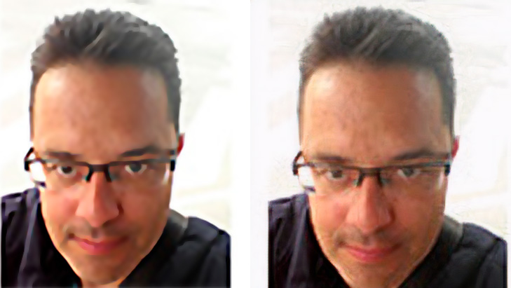 Взял фотку побольше - просто проверить. То же самое - слева просто ресайз (без размытия), справа результат работы сервиса. Похоже, что вся работа "искусственного интеллекта" - заресайзить и подблюрить, более ничего.