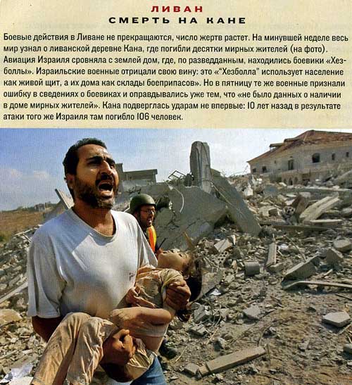 бомбёжка в Кфар Кана. Сначала сообщили о 60 погибших, из них больше половины детей, а потом выяснилось, что погибло 28 человек. Тоже много, но есть разница.