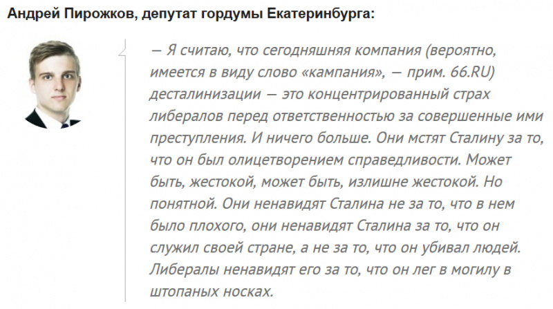 По мнению Пирожкова, «на фоне ничтожества и мерзости нашего руководства фигура Сталина встает в исполинский рост и заслоняет собой всю оставшуюся историю»...