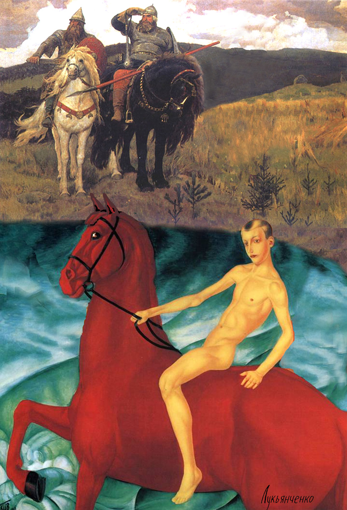Копьё у витязя со второй картины точно не Ильи Муромца. У копья Ильи остриё другой формы и нет шарика перед остриём, а копьё витязя заострено сзади, в отличие от копья Ильи.