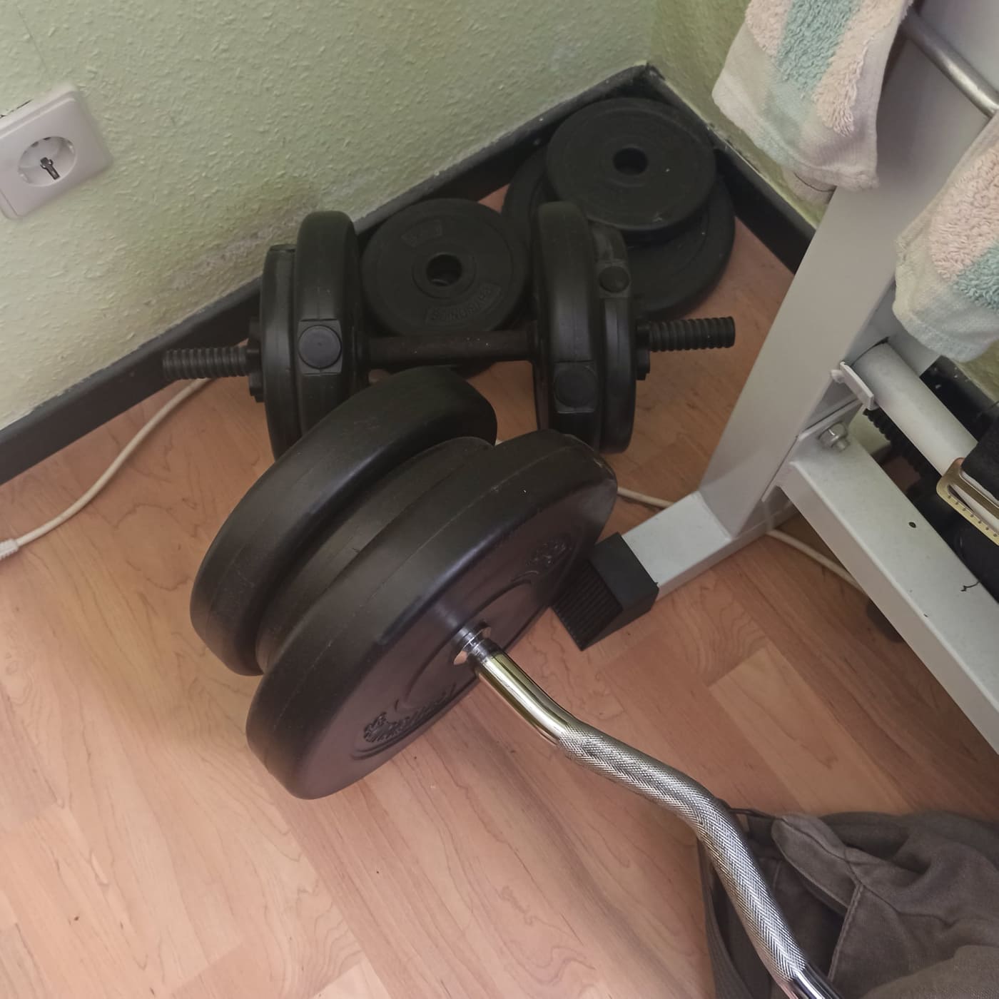 О, у меня тоже почти такой же набор уже лет 5 в обороте. И каждый сам себе блины "нарезает" - у меня 8кг., у жены - 3, сын раньше тоже занимался, пока учиться не уехал.