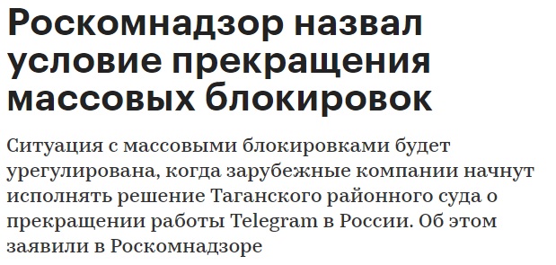 В самой новости нет ничего особенного: то, что Telegram заблокировать невозможно, было понятно любому грамотному человеку. Это только прекрасные люди из шарашки под названием РКН считают, что если на кухне переколотить всю посуду и всю мебель, то можно в конце концов убить комара. Милые и предельно наивные люди, которые на кухне уже все переколотили, а теперь пошли гостиную разносить, дай бог им здоровья.