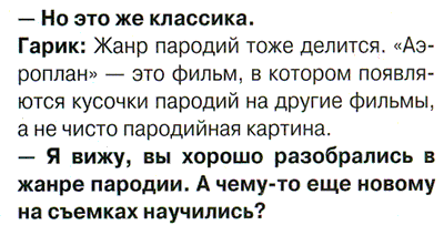 В "МК-бульваре" - интервью с Гариком Харламовым. Обычная промоутерская шняга этого "Самого лучшего фильма 2" - они смелые первопроходцы, намерены сделать идеальный комедийный фильм и попасть в золотой фонд юмора. Ля-ля-ля, бла-бла-бла. Но есть один любопытный момент, демонстрирующий познания Харламова в жанре пародии.