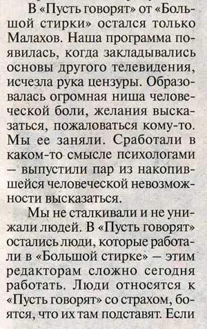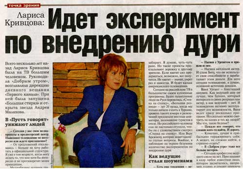 Прочитал в "Собеседнике" интервью с Ларисой Кривцовой - это бывший большой руководитель на ТВ, при которой появилась "Большая стирка", взошла звезда Андрея Малахова и так далее.