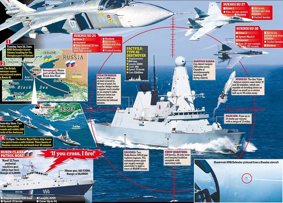 Россия закрыла свои террводы для прохода военных кораблей. Британия считает, что им это не указ. Непонятно зачем и кому нужна эта эскалация...Изучай. Нет там никаких территориальных вод росии.