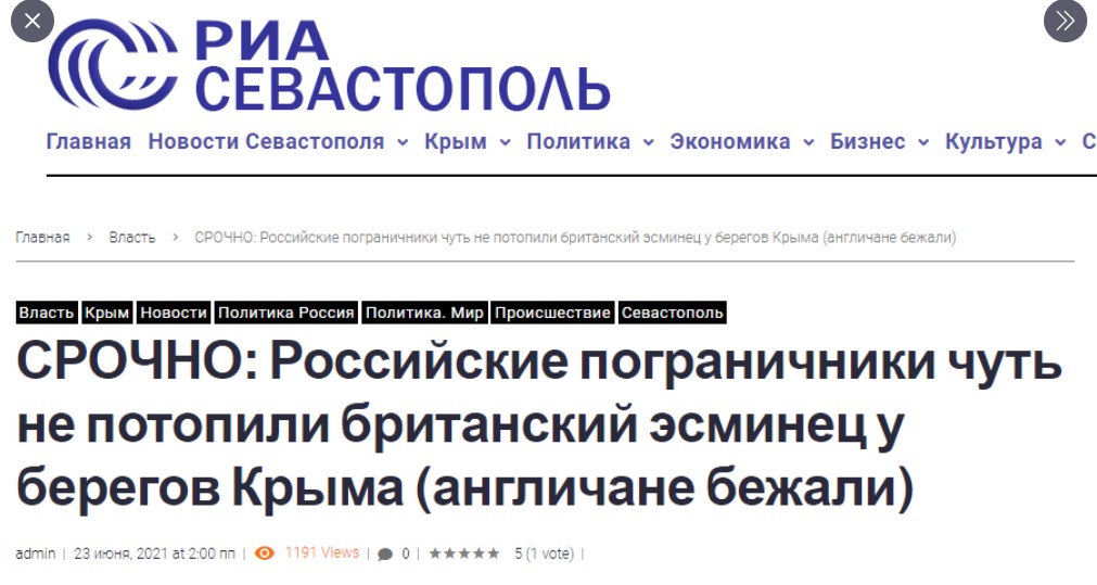 Поскольку украинский корабль могли и потопить, британский запустить было безопаснее. Британцы отчитались о поддержке Украины, Россия отчиталась о границе на замке, все довольны, можно на пляж, вода уже до 25 прогрелась.