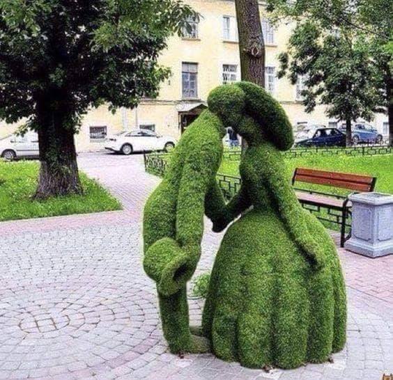 Яркая топиарная скульптура украсила дворик на Фонтанке близ усадьбы купца Глебова и стала новой городской достопримечательностью, которую облюбовали все без исключения петербуржцы. Зеленую влюбленную парочку установили практически год назад по заказу МО «Семеновский», а создали ее дизайнеры из творческой мастерской TOPiART, вдохновившись подобными памятниками в Англии и Франции. Любопытно то, что девушка и парень выглядят сотканными из травы и веток, но на самом деле созданы из проволоки и искусственного газона, отчего остаются вечнозелеными даже в непогоду.